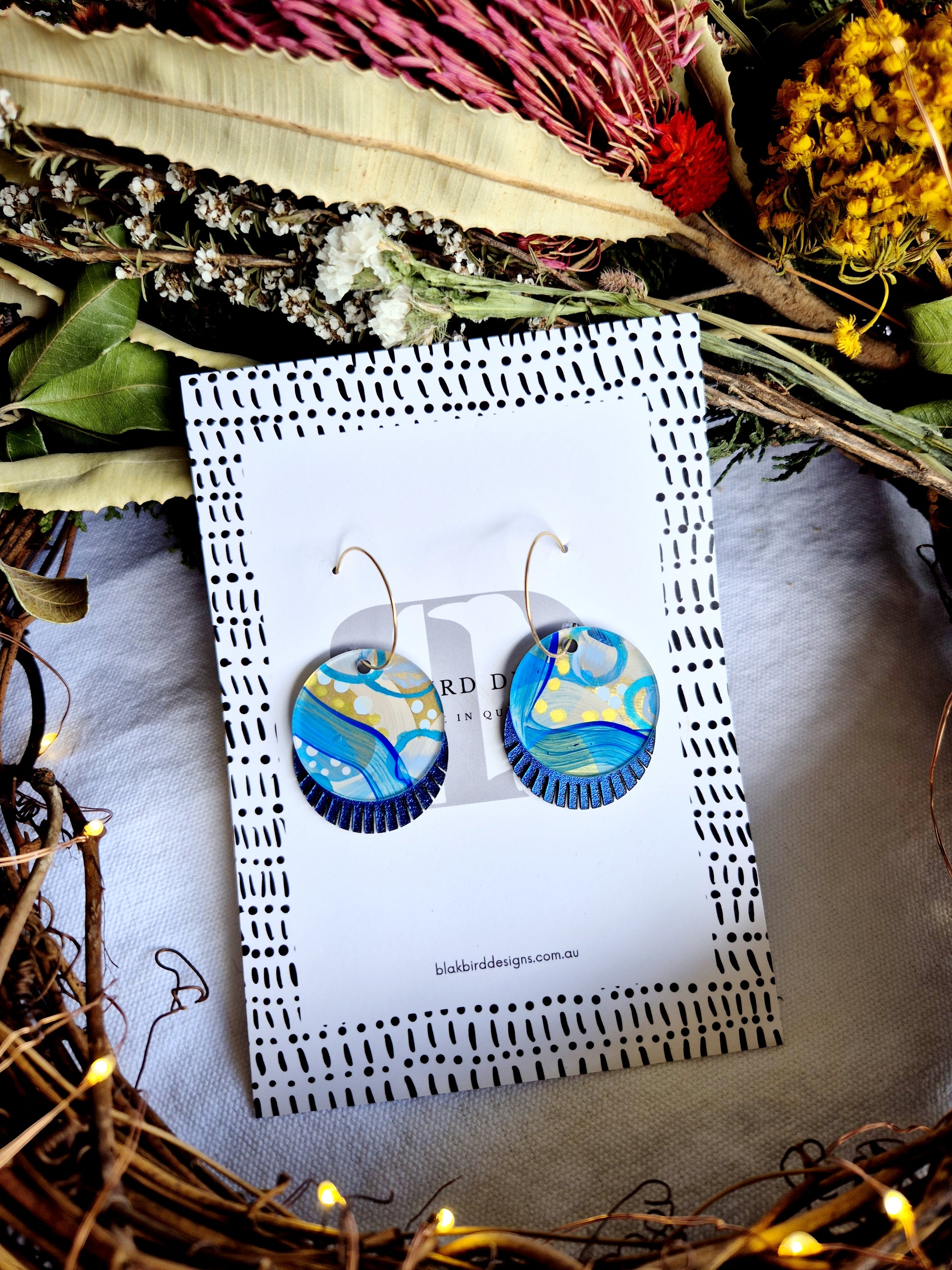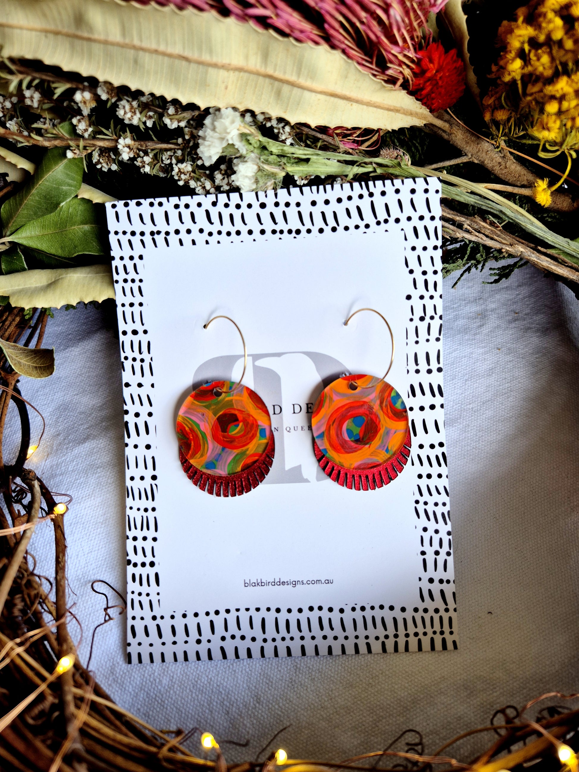 Strong, symbolic and unmistakably Australian, these Circle Disc Hoops are a powerful fusion of art and material. Featuring a hand-painted circular acrylic disc showcasing unique Aboriginal artwork, each piece is suspended from a gold-tone hoop and finished with an Australian kangaroo leather feature for added depth and texture.