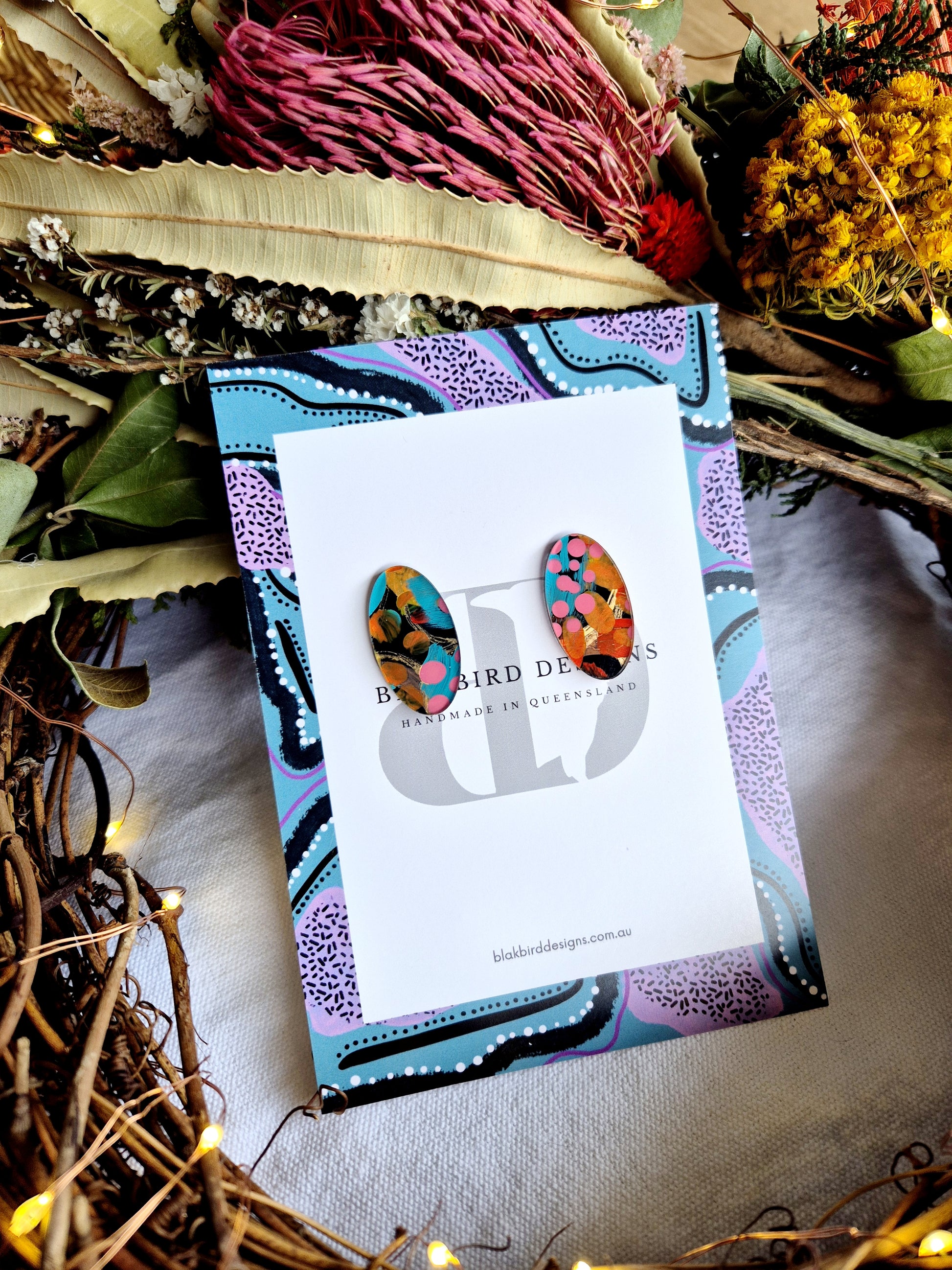 Small in size, bold in story. These Oval Artwork Studs feature a hand-painted acrylic oval showcasing unique Aboriginal artwork, making each pair a subtle yet powerful expression of wearable art.