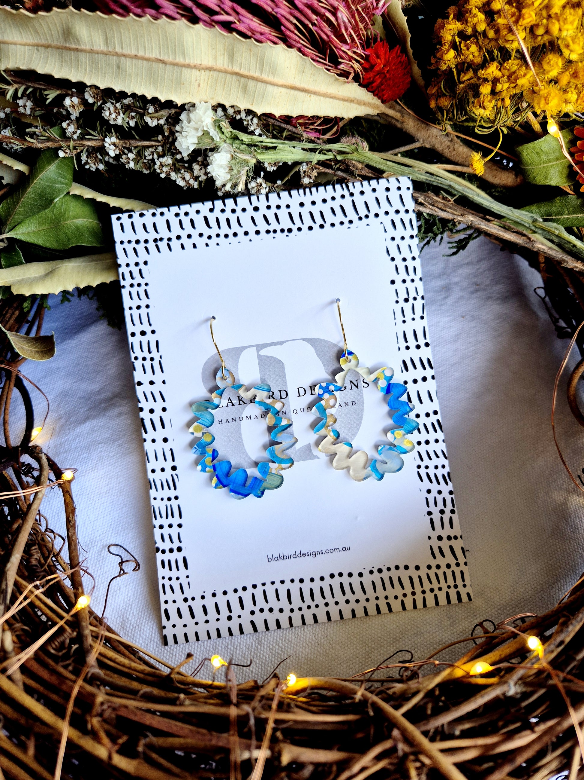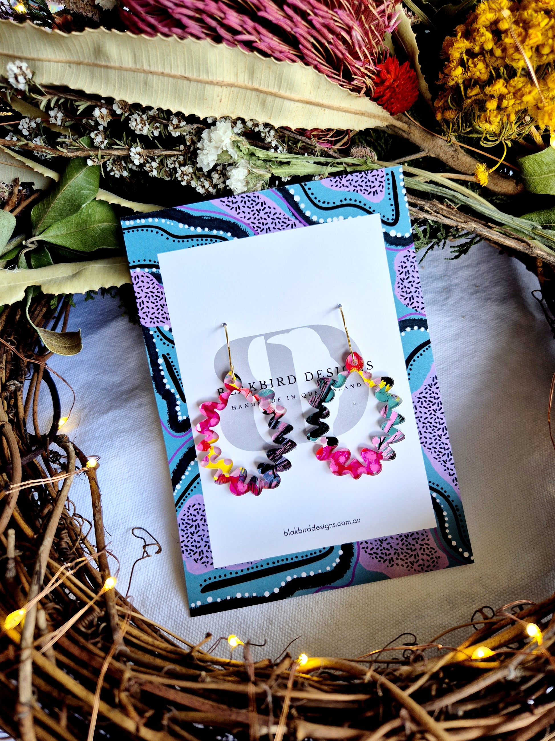 Each pair of our Squiggle Hoops is a small, wearable artwork. Hand-painted in acrylic, these statement earrings feature unique Aboriginal artworks, meaning no two pairs are ever the same.